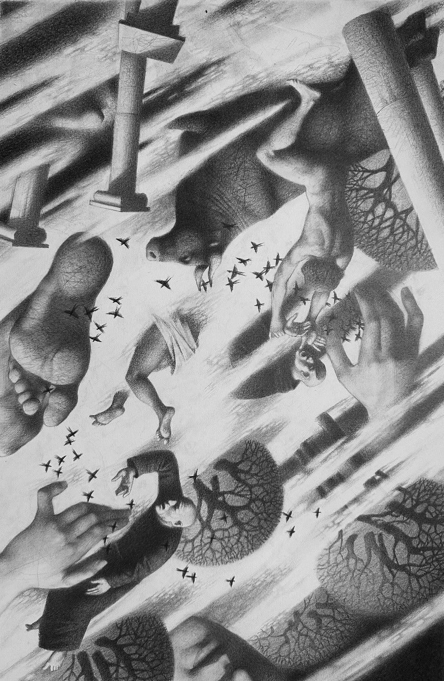 The artwork invites the viewer on a journey through worlds where reality intertwines with myth. The central image of a rider on a white horse becomes a symbol of wandering, seeking, and spiritual ascent.